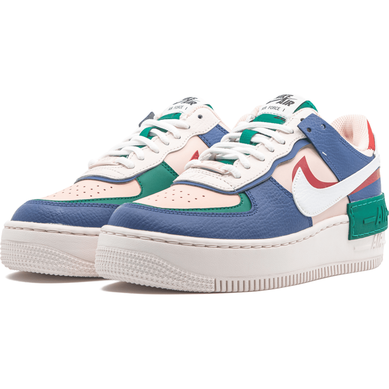 La silhouette est composée d’un upper (dessus de la paire) mélangeant des empiècements de cuirs allant du rose clair au bleu marine en passant par le vert ! Sur le côté de la paire on trouve deux Swoosh superposés, un rouge et un blanc en cuir. Le branding situé au niveau du talon et de la languette est lui aussi doublé.